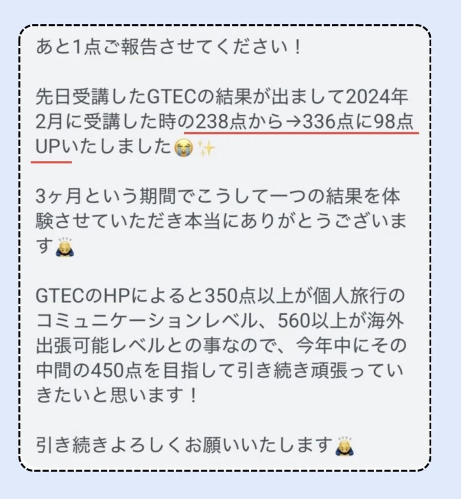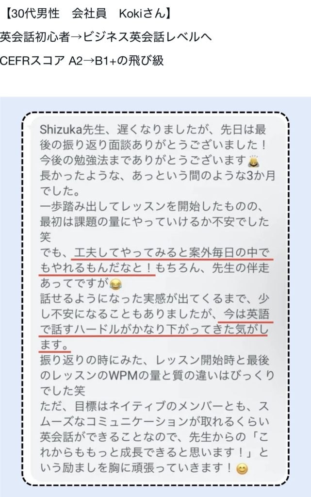 CEFR スコア(語学レベル)『A2』初心者レベルから『B1+』ビジネスレベルに飛び級されたりなど多くの生徒さんが成果を出されています。